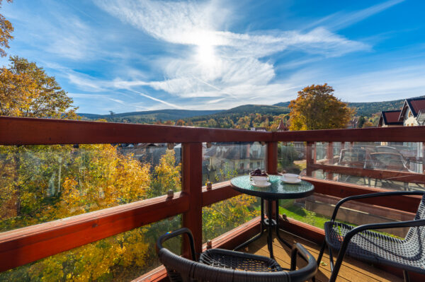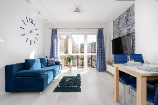 Apartament składa się z salonu z wyjściem na balkon połączonego z aneksem kuchennym, komfortowej sypialni oraz łazienki wyposażonej w wannę z możliwością korzystania z prysznica. Z balkonu rozpościera się widok na Góry Izerskie, który podkreśla górski charakter pobytu. Do dyspozycji gości pozostają dwa łóżka dwuosobowe, zestaw wypoczynkowo-kawowy, stół z czterema krzesłami, stolik kawowy oraz TV w salonie. Aneks kuchenny umożliwia wygodne przygotowywanie posiłków podczas pobytu.