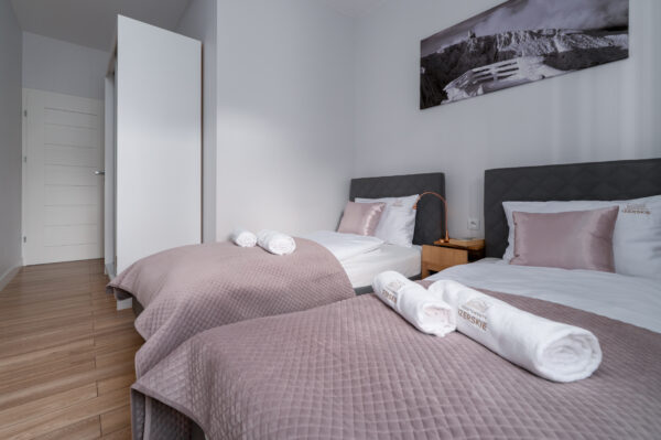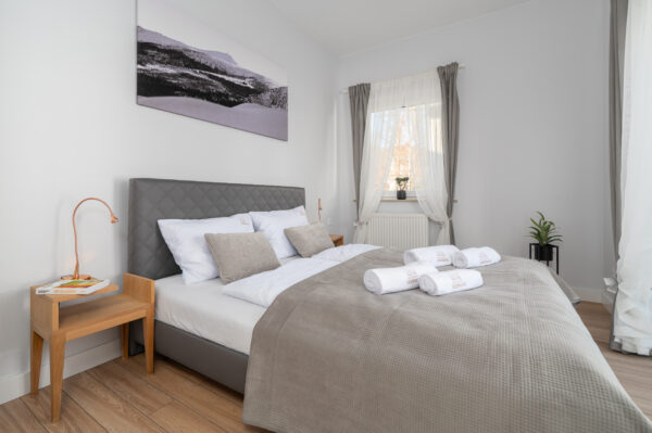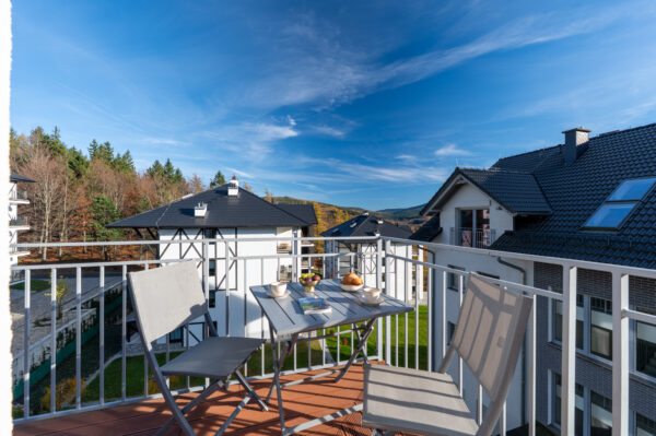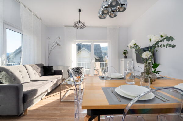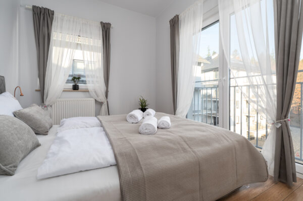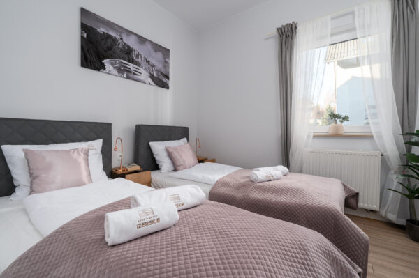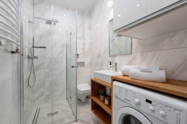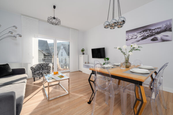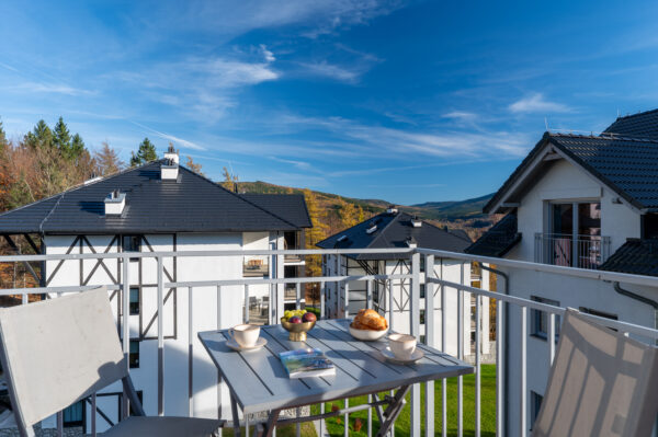 Wnętrze obejmuje salon z wyjściem na balkon połączony z aneksem kuchennym, oddzielną sypialnię oraz przestronną łazienkę. Z balkonu rozciąga się widok na Pogórze Izerskie, który stanowi dodatkowy atut apartamentu. Do dyspozycji pozostaje łóżko dwuosobowe, rozkładana sofa, stół z czterema krzesłami, stolik kawowy oraz TV. Aneks kuchenny umożliwia wygodne przygotowywanie posiłków podczas pobytu.