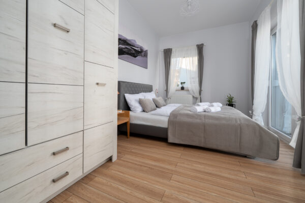 Apartament Rubinowy to wygodny i nowoczesny apartament 2-pokojowy o powierzchni 33 m², położony na II piętrze budynku. Przemyślany układ pomieszczeń oraz przyjemna, współczesna stylistyka wnętrza tworzą komfortową przestrzeń na wypoczynek dla 2–4 osób.