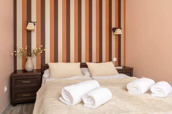 Wnętrze obejmuje obszerny salon z wyjściem na balkon połączony z aneksem kuchennym, dwie oddzielne sypialnie oraz przestronną łazienkę. Z balkonu rozciąga się przepiękny widok na panoramę Gór Izerskich, który stanowi wyjątkowy atut apartamentu. Do dyspozycji pozostaje łóżko dwuosobowe, dwa łóżka pojedyncze, rozkładana sofa, stół z czterema krzesłami, stolik kawowy oraz dwa telewizory (w salonie i sypialni). Aneks kuchenny umożliwia wygodne przygotowywanie posiłków na miejscu.